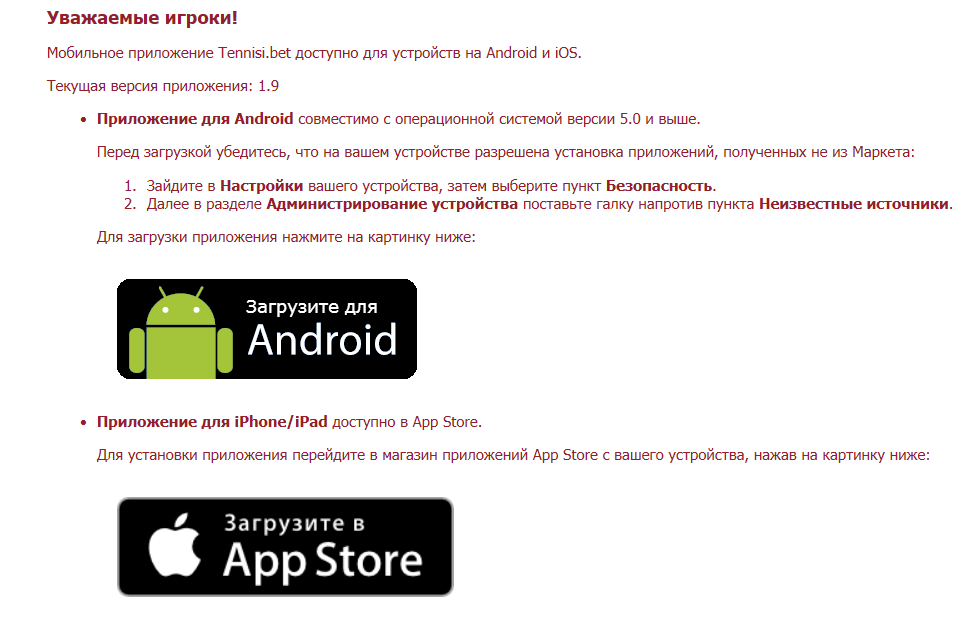 В виду того что правила Google запрещают размещать софт, связанный с азартными играми на Play Market, скачать установочный файл приложения можно только с сайта букмекера – раздел «Мобильные приложения». На указанной странице следует нажать кнопку «Загрузите для Android» и дождаться закачки файла tennisi_bet.apk. Если этого не произошло, то следует разрешить смартфону скачивать приложения из сторонних источников. Делается это посредством проставления галочки в соответствующем пункте раздела «Безопасность» в настройках вашего смартфона.