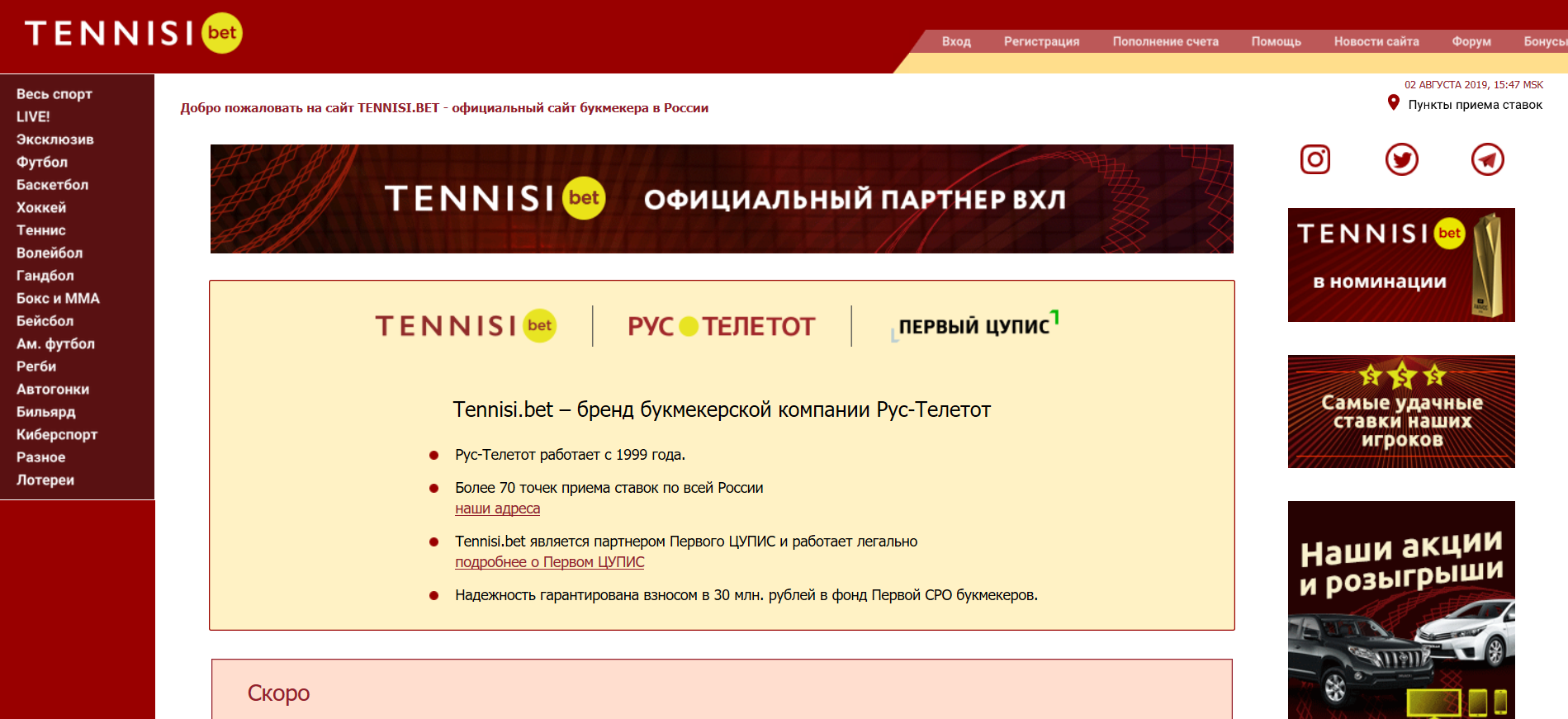 «Тенниси» — один из старейших букмекерских брендов в России и СНГ. Компания начинала свою деятельность в далеком уже 1999 году с открытия пунктов приема ставок. До сих пор сеть наземных ППС рассматривается конторой в качестве её ценнейшего актива. Букмекер имеет несколько сайтов в различных доменных зонах («bet», «kz», «com»), которые подпадают, соответственно, под юрисдикцию РФ, Казахстана, офшорный вариант. Бренд/торговая марка «Тенниси» принадлежит ООО «Рус-Телетот». Присоединившись к ЦУПИС в конце 2017 года, букмекер начал легально принимать в интернете ставки от граждан РФ на домене tennisi.bet.