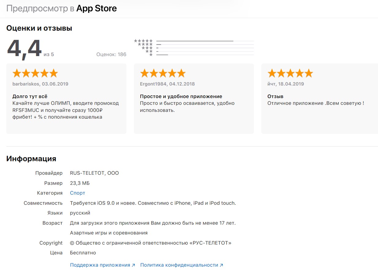 Приложение Tennisi.bet для iOS доступно в App Store. Распространяется оно бесплатно. В качестве разработчика указана компания «Рус-телетот». Софт располагается на 15 позиции в категории «Спорт» и имеет среднюю оценку 4.4 из 5 баллов на основании более 180 оценок юзеров.